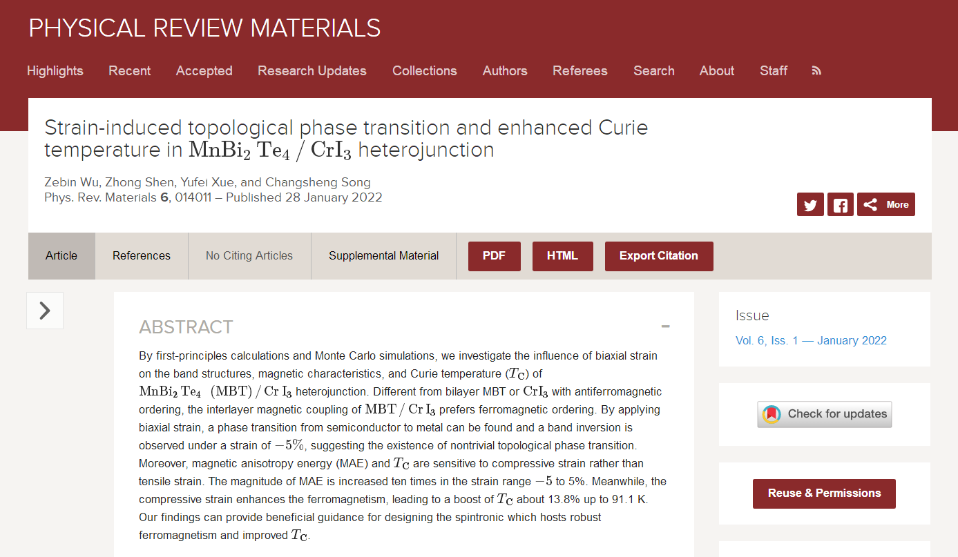 近日,理学院物理系计算物理团队宋昌盛副教授课题组以“Strain-induced topological phase transition and enhanced Curie temperature in MnBi2Te4/CrI3 heterojunction” 为题发表于Phys. Rev. Materials 6, 014011 (2022) (论文链接:https://journals.aps.org/prmaterials/abstract/10.1103/PhysRevMaterials.6.014011)。