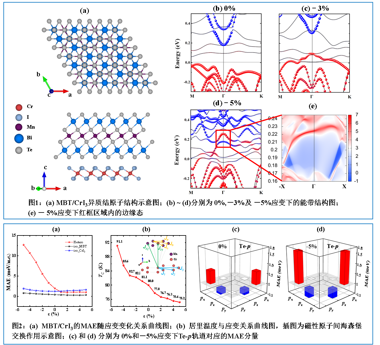 课题组采用基于密度泛函理论的第一性原理计算研究了由单层MBT和磁性半导体CrI3构成的MnBi2Te4/CrI3异质结。研究发现不同于具有层间反铁磁耦合的MBT和CrI3双层结构, MnBi2Te4/CrI3异质结界面会由于自旋交换带来较强的层间铁磁耦合。通过施加双轴应变对层间相互作用的调控,其能带结构中MBT费米能级附近轨道贡献会发生反转,从间接带隙转为直接带隙。特别是在-5%压缩应变情况下出现能带翻转,表现出一种界面拓扑行为。此外,文章还指出,在压缩应变下异质结的磁各向异性能(MAE)会出现近10倍的显著提升。相应的居里温度在压缩应变下也能从80K提升至91K,而单独材料仅为12K(MBT)和45K(CrI3)。该工作为二维MBT铁磁体实现拓扑相变提供了研究方向,同时也为设计具有强铁磁性及高居里温度的自旋电子器件提供了理论指导。
