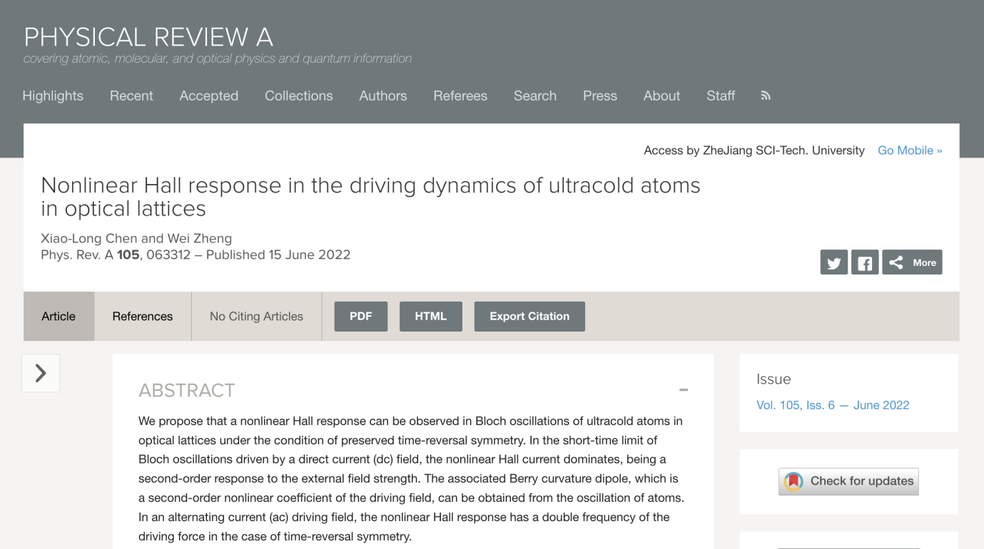 [3] X.-L. Chen and W. Zheng, Nonlinear Hall response in the driving dynamics of ultracold atoms in optical lattices, Phys. Rev. A 105, 063312 (2022).
