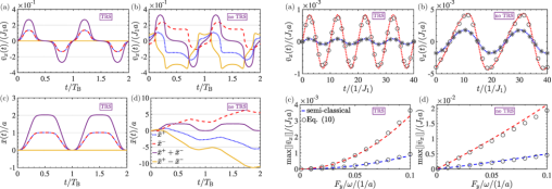 该工作提出,在保有时间反演对称的光学晶格中,我们可以借助于超冷原子的布洛赫振荡观测非线性霍尔响应[3]。当系统由直流‘电场’驱动时,非线性霍尔电流在布洛赫振荡的短时间极限下占据主导地位,表现为外部‘电场’场强的二阶响应(下图1)。而对应的驱动场的二阶非线性系数,即能定量地表征非线性霍尔响应强度的贝里曲率偶极子(Berry Curvature Dipole),可以从原子的振荡行为中直接提取出来。此外在考虑交流‘电场’驱动时,非线性霍尔响应则拥有外交流驱动场的双倍振荡频率,而贝里曲率偶极子可通过振荡幅度直接获得(下图2)。该工作为超冷原子光晶格实验中实现和观察新奇的非线性霍尔效应提供了理论指导和计算支持。