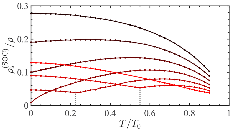超流体是一种新奇的物质状态,特点是流动的液体中完全缺乏黏性并且流动不损耗动能。如果将超流体放置于环状容器中,由于没有摩擦力,它可以永无止尽地流动。超流体是在1937年由Kapitsa、Allen 和Misener同时在液氦(Helium-4)当中发现的。通过降低液氦温度至2.17K以下,他们发现了其中低粘滞等超流特性。现如今,液氦同位素以及超冷原子气体是观测和研究超流特性的常用物理系统,并且超流与冷原子气体中玻色-爱因斯坦凝聚(BEC)有着非常紧密的联系。当降低系统温度时,液氦中超流密度以及常规弱相互作用BEC中凝聚体密度都有着关于温度的单调递减行为,如图1。然而,我们发现,在自旋轨道耦合BEC中,超流密度却有着非比寻常的温度依赖关系。