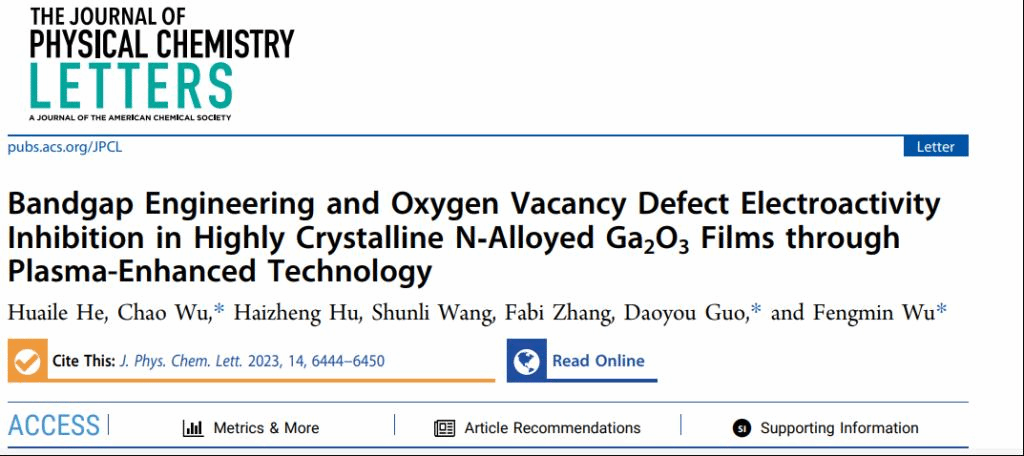 近日,物理学系浙理工氧化镓团队,在国际著名期刊《Journal of Physical Chemistry Letters》上发表了题为“Bandgap Engineering and Oxygen Vacancy Defect Electroactivity Inhibiting in High Crystalline N-Alloyed Ga2O3 Films Through Plasma-Enhanced Technology”的学术论文(J. Phys. Chem. Lett. 2023, 14, 6444−6450. https://pubs.acs.org/doi/full/10.1021/acs.jpclett.3c01368)。浙江理工大学为第一论文署名单位,吴超博士、郭道友特聘教授和吴锋民教授为共同通讯作者。该工作得到了国家自然科学基金项目、浙江省万人计划青年拔尖人才项目、浙江理工大学科研启动科技基金的支持。