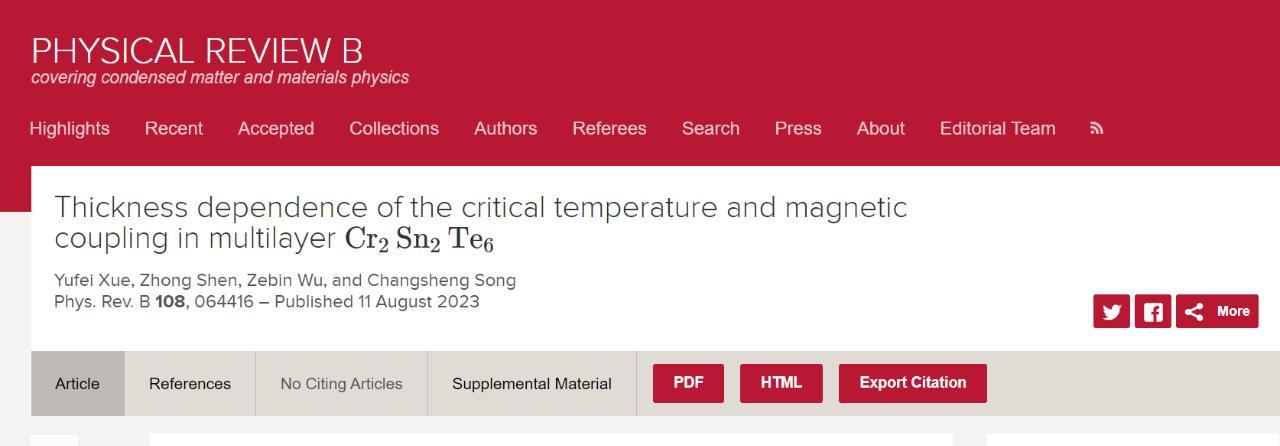 近日,理学院物理系计算物理团队宋昌盛副教授,在国际著名物理旗舰期刊《Phys. Rev. B》上发表了题为“Thickness dependence of the critical temperature and magnetic coupling in multilayer Cr2Sn2Te6”的学术论文。