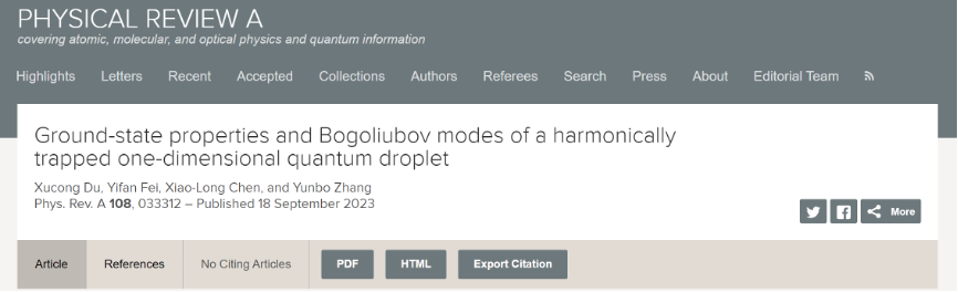 近日,理学院物理系计算物理团队张云波教授在国际著名物理期刊《Phys. Rev. A》上发表了题为“Ground-state properties and Bogoliubov modes of a harmonically trapped one-dimensional quantum droplet”的学术论文。