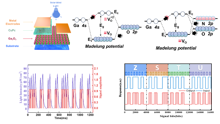 价带轨道杂化是调控氧化物半导体氧空位的重要手段,通过引入具有高p轨道能级的离子,与氧化物的O 2p轨道耦合,能有效屏蔽氧空位的杂质能级并抑制其电活性。本工作通过在β-Ga2O3中引入氮元素(N),利用N 2p与O 2p轨道杂化,并与金属d轨道电子相互作用,从根本上改变了β-Ga2O3价带附近的能带结构,有效屏蔽了氧空位深能级缺陷对载流子的捕获,进而抑制了器件的持续光电导效应。我们制备的β-Ga2O3基日盲深紫外探测器展现出超低的暗电流(10-14A),优异的光/暗电流比(106),以及快的光响应速度(0.008秒)。在此基础上,以β-Ga2O3基日盲深紫外探测器、可编程逻辑门阵列为核心,设计并搭建了一套硬件体积小、无需滤波装置且抗干扰能力强的日盲深紫外光通信系统。本工作为氧化物半导体的氧空位调控与电活性抑制、以及高性能β-Ga2O3基日盲深紫外探测器的开发提供了理论和技术支持。