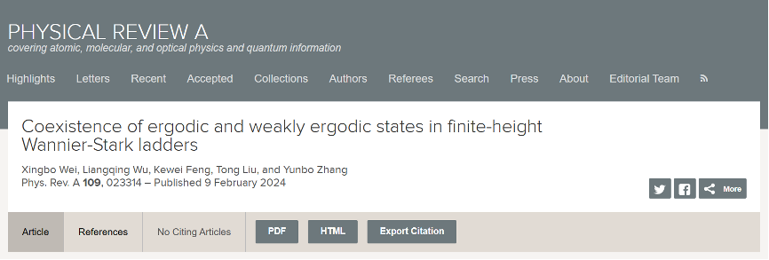 近日,理学院计算物理团队魏兴波博士,张云波教授与南京邮电大学刘通博士合作在国际著名物理期刊《Phys. Rev. A》上发表了题为“Coexistence of ergodic and weakly ergodic states in finite-height Wannier-Stark ladders”的学术论文。