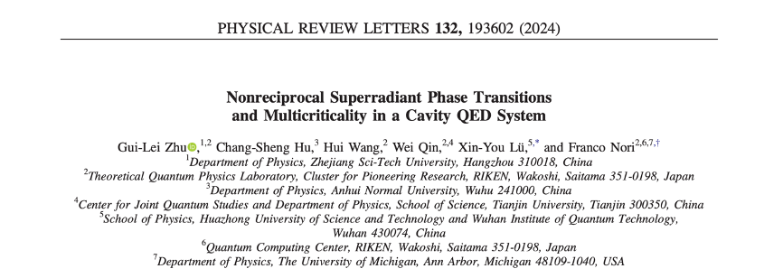 近日,我系青年教师朱贵蕾博士在国际物理学顶级期刊Physical Review Letters发表了题为 “Nonreciprocal Superradiant Phase Transitions and Multicriticality in a Cavity QED System” 的研究论文。朱贵蕾博士是论文的第一作者,浙江理工大学理学院为第一署名单位,华中科技大学的吕新友教授和日本理化学研究所的Franco Nori教授为共同通讯作者。该工作受到科技部国家重点研发计划(2021YFA1400700)的资助。