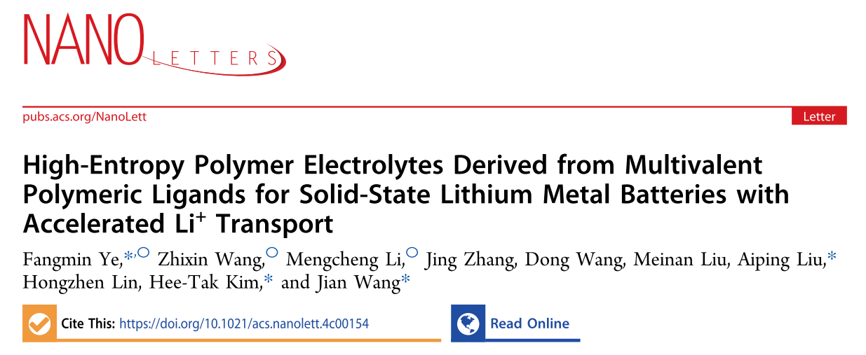近日,理学院物理系能源材料&锂电池研究团队(EMLab)在固态聚合物电解质方面取得进展,在国际著名期刊《Nano Letters》上在线发表了题为“High-Entropy Polymer Electrolytes Derived from Multivalent Polymeric Ligands for Solid-State Lithium Metal Batteries with Accelerated Li+ Transport” 的学术论文。