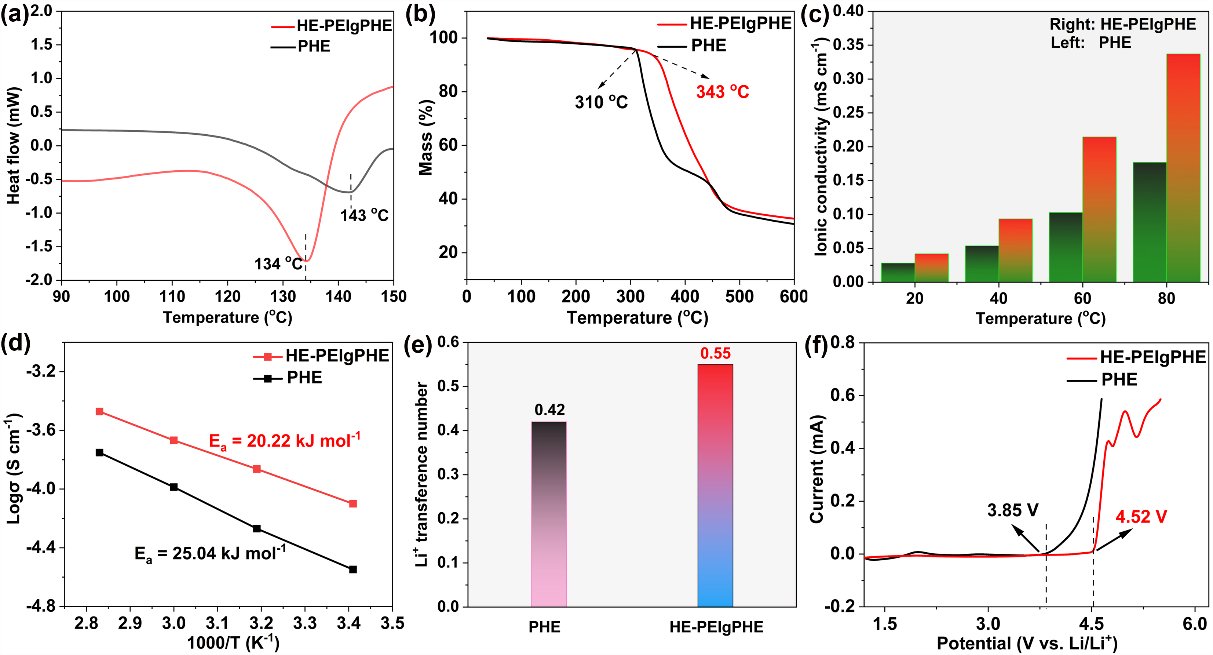为了发展聚合物电解质,助推固态锂金属电池的发展,提出构建多组分体系的聚合物(混合或交联策略)是一条可行的策略。通过这种策略,可增加聚合物链的混乱度,减少锂离子跳跃式的传输,增加锂离子迁移数及离子电导率,同时交联亦可增强电解质膜的力学性能。但是多成分体系的设计面临成分的选择和溶剂的筛选等挑战。于此,我们团队提出了两种聚合物通过多维度点击反应的交联策略构建高熵电解质(图1),提高了聚合物分子链的无序度,降低了聚合物的结晶性(图2a),缩短了锂离子输运路径,改善了离子电导率和迁移数 (图2c,d和e)。另外,多维度交联改善了电解质膜的热稳定性(图2b)和电化学窗口(图2f)。由于聚合物膜物性的改善,由我们制备聚合物电解质膜构建的锂金属电池表现出优异的电化学稳定性和长循环寿命(300个循环,比容量保持率为98.7%)。