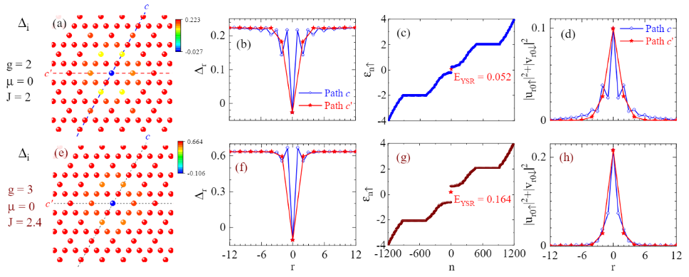 1 零温和零化学势下的自洽数值计算结果,参数为(g, J) = (2, 3)(3, 2.4)(a, e) 磁性杂质附近超导对势的等高线图;(b, f) 杂质附近沿cc′方向的对势空间分布;(c, g) 准粒子能谱与YSR态能量;(d, h) YSR 态的波函数空间分布。