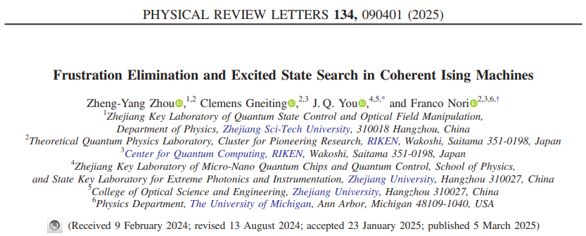 近日,我系青年教师周正阳博士在国际著名物理期刊Physical Review Letters上发表了题为“Frustration Elimination and Excited State Search in Coherent Ising Machines”的研究论文。周正阳博士为论文的第一作者,浙江大学的游建强教授和日本理化学研究所的Franco Nori教授为共同通讯作者,浙江理工大学为论文的第一署名单位。该工作依托于浙江省全省量子物态与光场调控重点实验室完成,并得到了浙江省全省微纳量子芯片与量子调控重点实验室以及极端光学技术与仪器全国重点实验室的技术支持。同时,该工作得到了国家自然科学基金以及浙江理工大学科研启动基金的经费支持。