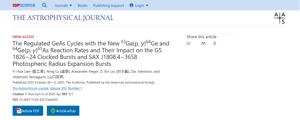 近日,天文天体物理领域国际知名期刊《The Astrophysical Journal》上刊发了题为“The Regulated GeAs Cycles with the New 63Ga(p,γ)64Ge and 64Ge(p,γ)65As Reaction Rates and Its Impact on the GS 1826−24 Clocked Bursts and SAX J1808.4−3658 Photospheric Radius Expansion Bursts”的学术论文。理学院物理学系特聘教授蓝乙华为论文第一作者,浙江理工大学、全省量子物态与光场调控重点实验室为论文署名单位。该工作得到了国家自然科学基金、浙江理工大学基础研究、中国科学院国际人才等项目支持。