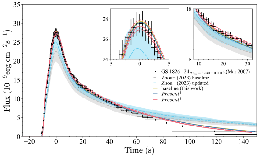 Figure 1: The observed and modeled burst light-curve profiles of the GS 1826−24 clocked burster (epoch 2007 March). The observed burst light-curve profile (black dots) is plotted against the respective modeled counterparts. Modeled light-curve profiles from IMP/CAS (2023): baseline (dashed gray line) and updated (dashed cyan line). The light-curve profiles based on the new proton capture reaction rates of gallium-63 and germanium-64 (Present‡; red solid, dashed, and dot-dashed lines). The impact of new reaction rates on burst light curves is discernible.
