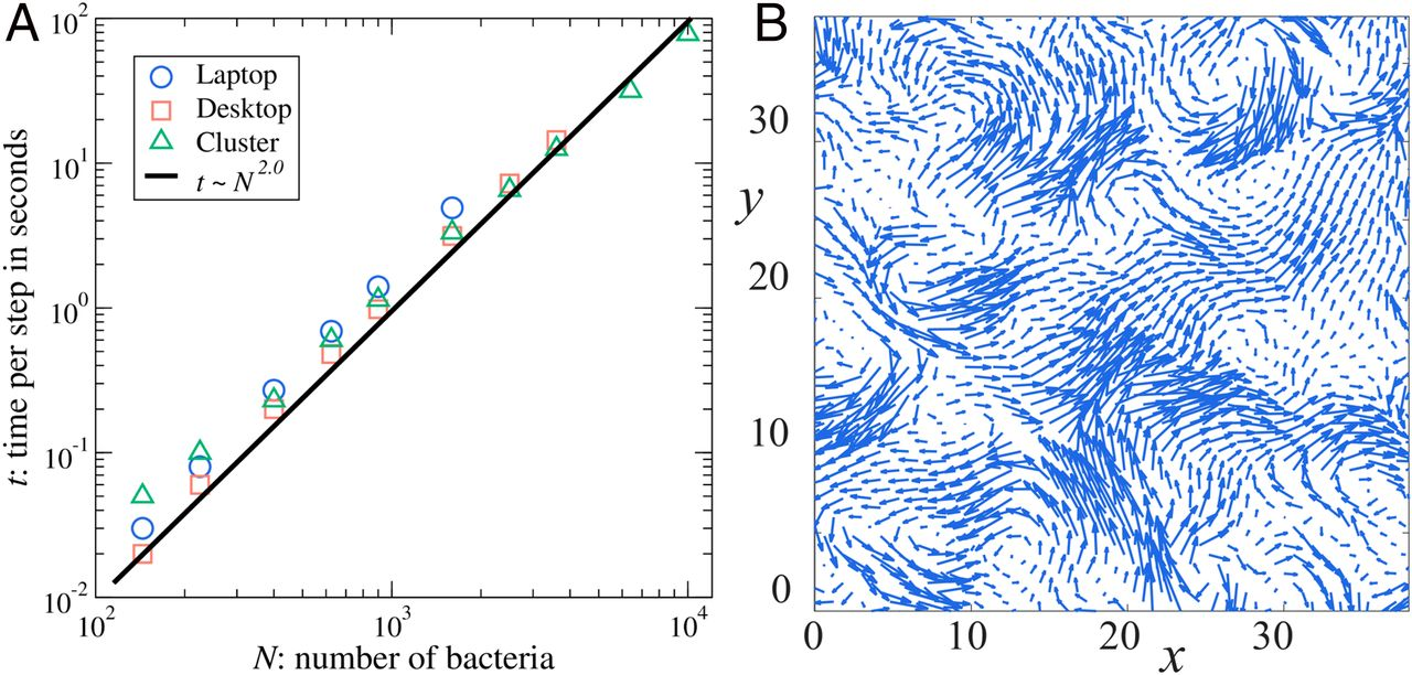 图2:(A) 计算时间-细菌数目、(B) 细菌速度场