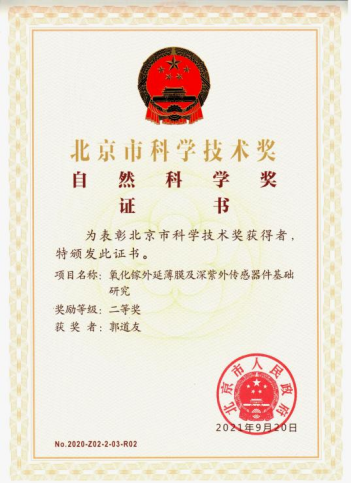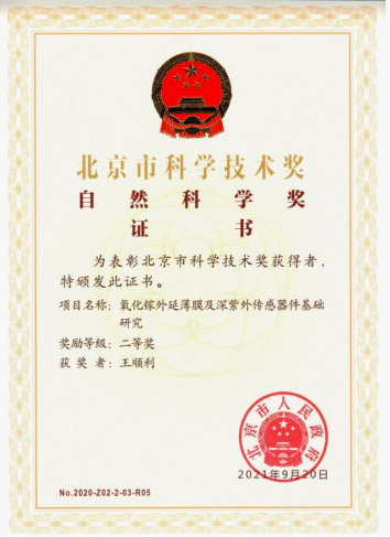 2021年9月25日,2020年度北京市科学技术奖在2021中关村论坛上正式揭晓,理学院物理系青年教师郭道友、王顺利博士与北京邮电大学唐为华教授团队合作完成的《氧化镓外延薄膜与深紫外传感器件基础研究》项目获得北京市自然科学奖二等奖(浙江理工大学为第二完成单位,郭道友博士为第二完成人,王顺利博士为第五完成人)。该项目主要针对超宽禁带半导体氧化镓材料在日盲紫外探测和高功率器件领域应用开展的前瞻性基础研究工作,通过十年坚持不懈的努力,突破了氧化镓高质量外延薄膜的生长及掺杂性能调控的关键科学和核心技术问题,并在此基础上,开展了光电器件和功率器件的应用基础研究工作,获得高灵敏日盲紫外光电探测器件,并首创氧化镓日盲紫外阵列成像器件。