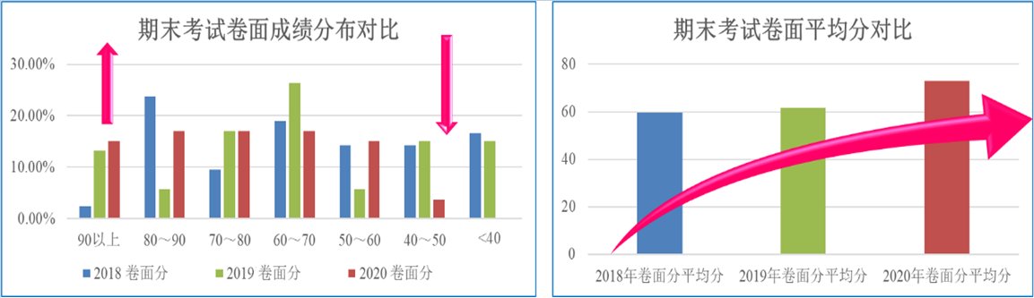 •学生成绩逐步提升 终结性评价中,学生优秀、良好的比例显著提高,不及格率明显降低,学生平均成绩稳定提升。