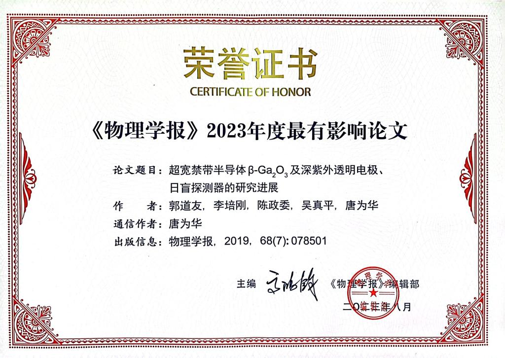 8月18日,中国物理学会秋季学术会议在宁夏召开。会上,浙江理工大学为第一单位、理学院物理学系郭道友特聘教授为第一作者发表的综述文章《超宽禁带半导体β-Ga2O3及深紫外透明电极、日盲探测器的研究进展》[物理学报,2019, 68(7): 078501. doi: 10.7498/aps.68.20181845]荣获“《物理学报》2023年度最有影响论文奖”。