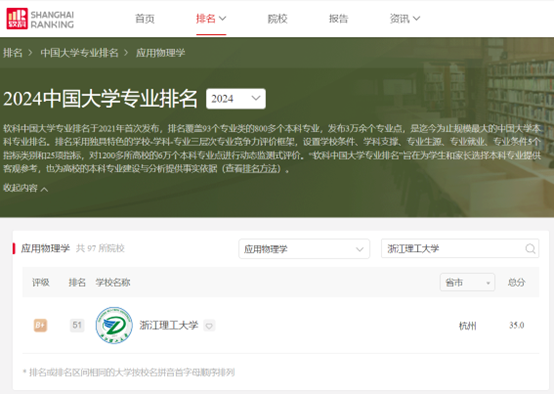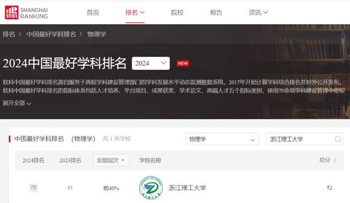 近日,2024软科中国最好学科排名正式发布。浙江理工大学物理学科位于第78名,位列前40%,同比去年前进了13名次,取得重大突破!应用物理学在2024软科中国大学专业排名中位列第51位,同比去年前进了11名次,评级由B上升到B+,进步明显!学科和专业发展均呈现快速上升趋势。