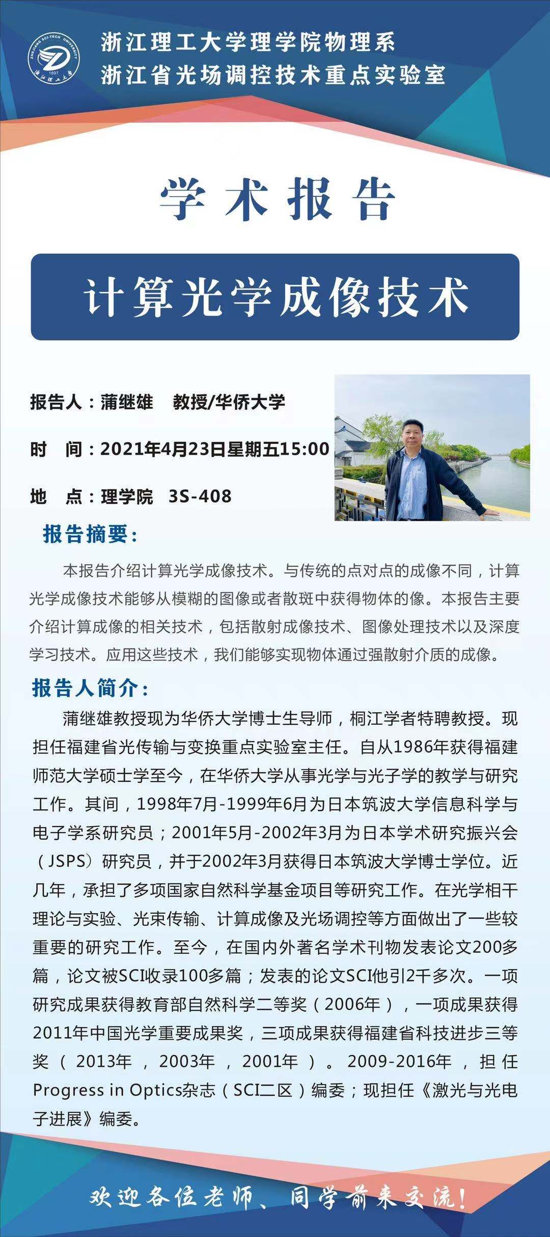 报告人简介:蒲继雄教授现为华侨大学博士生导师,桐江学者特聘教授。现担任福建省光传输与变换重点实验室主任。近几年承担了多项国家自然科学基金项目等研究工作。在光学相干理论与实验、光束传输、计算成像及光场调控等方面做出了一些较重要的研究工作。现担任《激光与光电子进展》编委。
