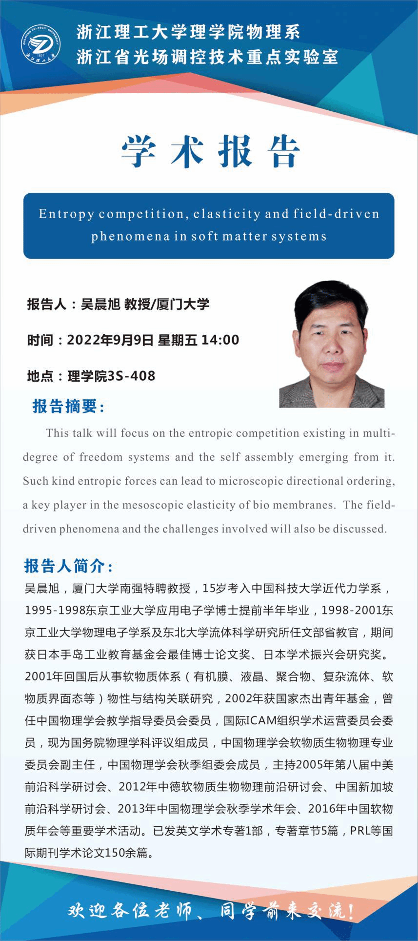 上一条:学术报告:高分子水凝胶仿生设计、成型加工与可控变形 下一条:学术报告:A self-consistent theory for quantum droplets of atomic gases