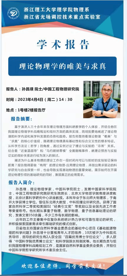 主讲人:孙昌璞院士/中国工程物理研究院 活动地点:一号楼2楼报告厅