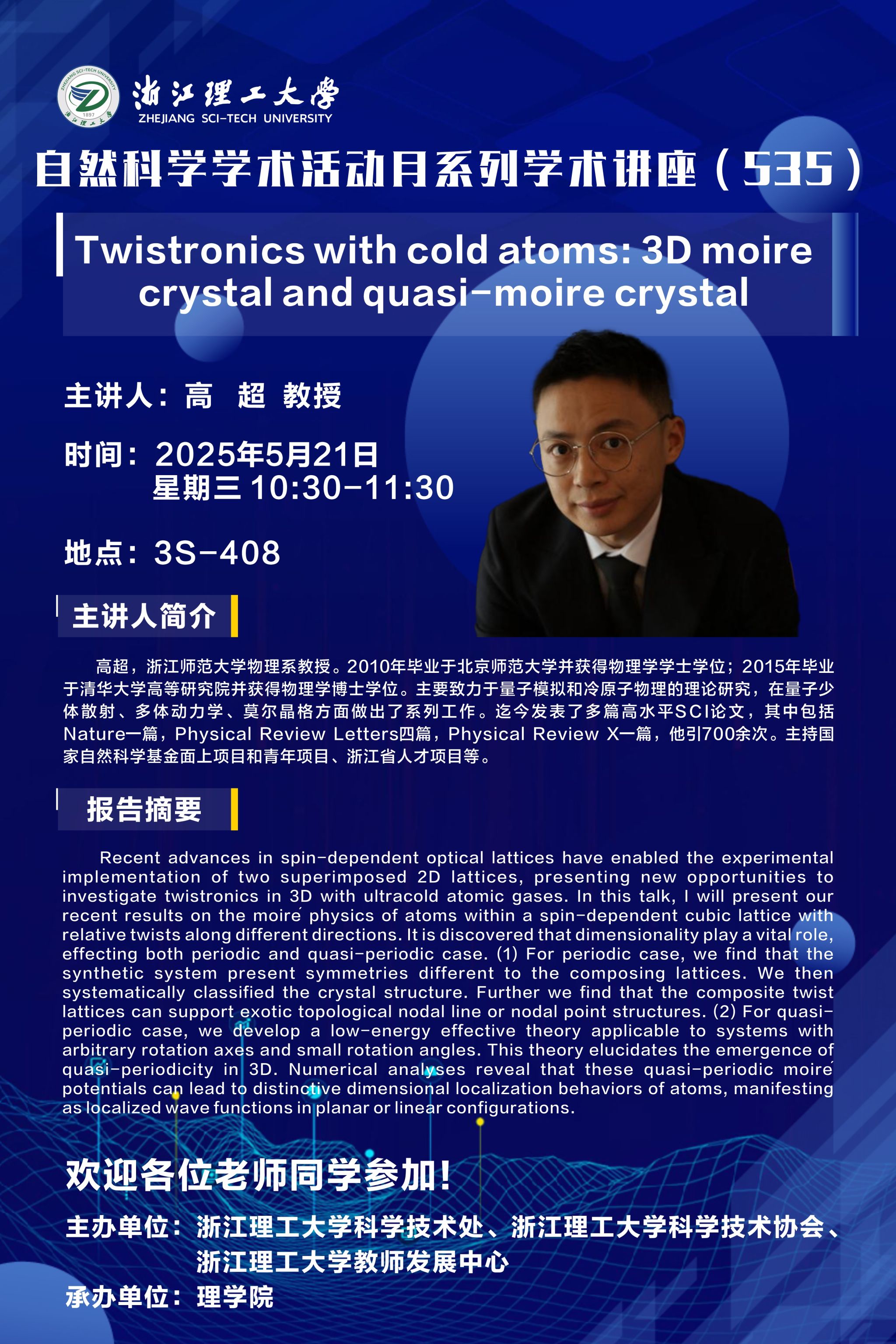 学术报告:Twistronics with cold atoms: 3D moiré crystal and quasi-moiré crysta