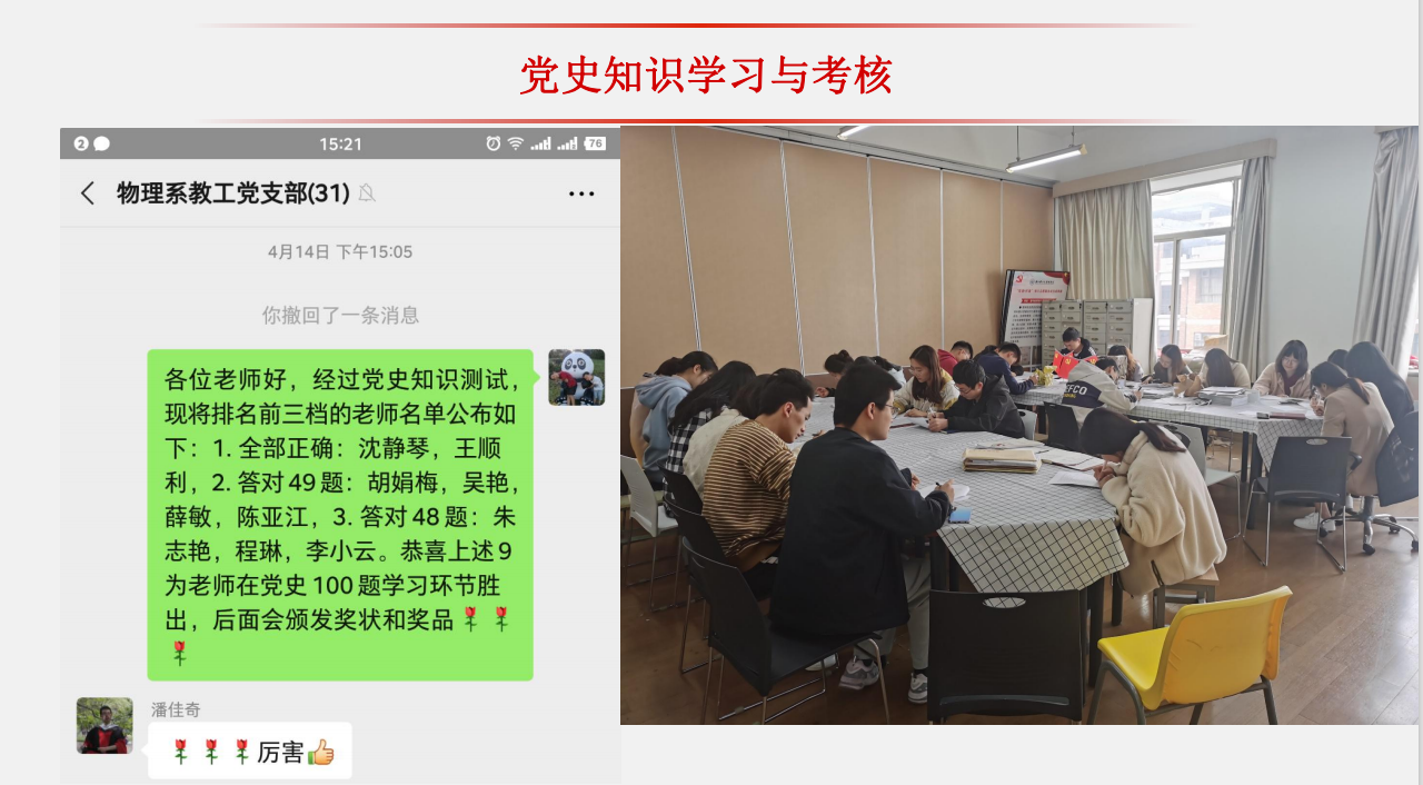 1)党史知识学习:物理系全体教师党员(研究生党员)通过网站、学习强国、公众号等 相关平台自主学习党史党建相关知识,了解中国共产党建党100年光辉历程。设立党 史党建知识100题题库,利用固定党日学习时间检验大家学习情况,做了一份党史手册,颁发了获奖名单。