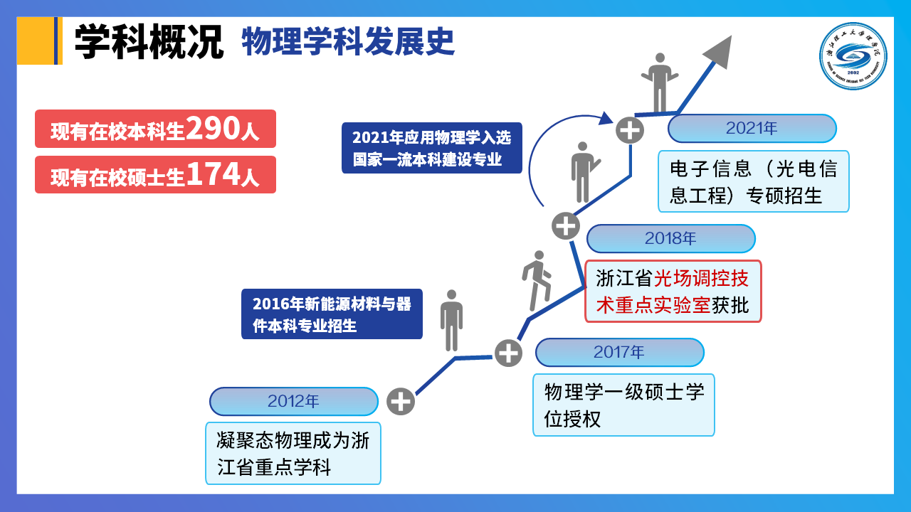 2、鲜明的学科特色:物理学科紧紧围绕国家和区域经济建设的需要,积极开展人才培养、科学研究和社会服务工作,形成了理论物理、凝聚态物理、光学、精密测量物理4个特色鲜明的研究方向。本学科围绕新奇量子材料物态和机理开展自旋调控、物态制备、材料设计等计算物理的研究;紧扣浙江省能源短缺的问题,在超宽禁带半导体、光伏、光解水制氢以及储能等方面取得了一系列研究成果;针对浙江省产业升级高端制造领域开展了机电一体化等领域的基础研究以及量子通讯和量子通讯的基础问题开展理论研究;围绕国家“十四五”科技创新规划对光学技术发展的新要求,开展了光学信息处理和微纳光学等领域的研究。同时,结合本校纺织科学特色,多学科交叉,开展了高性能复合纤维材料的基础和产业化研究。